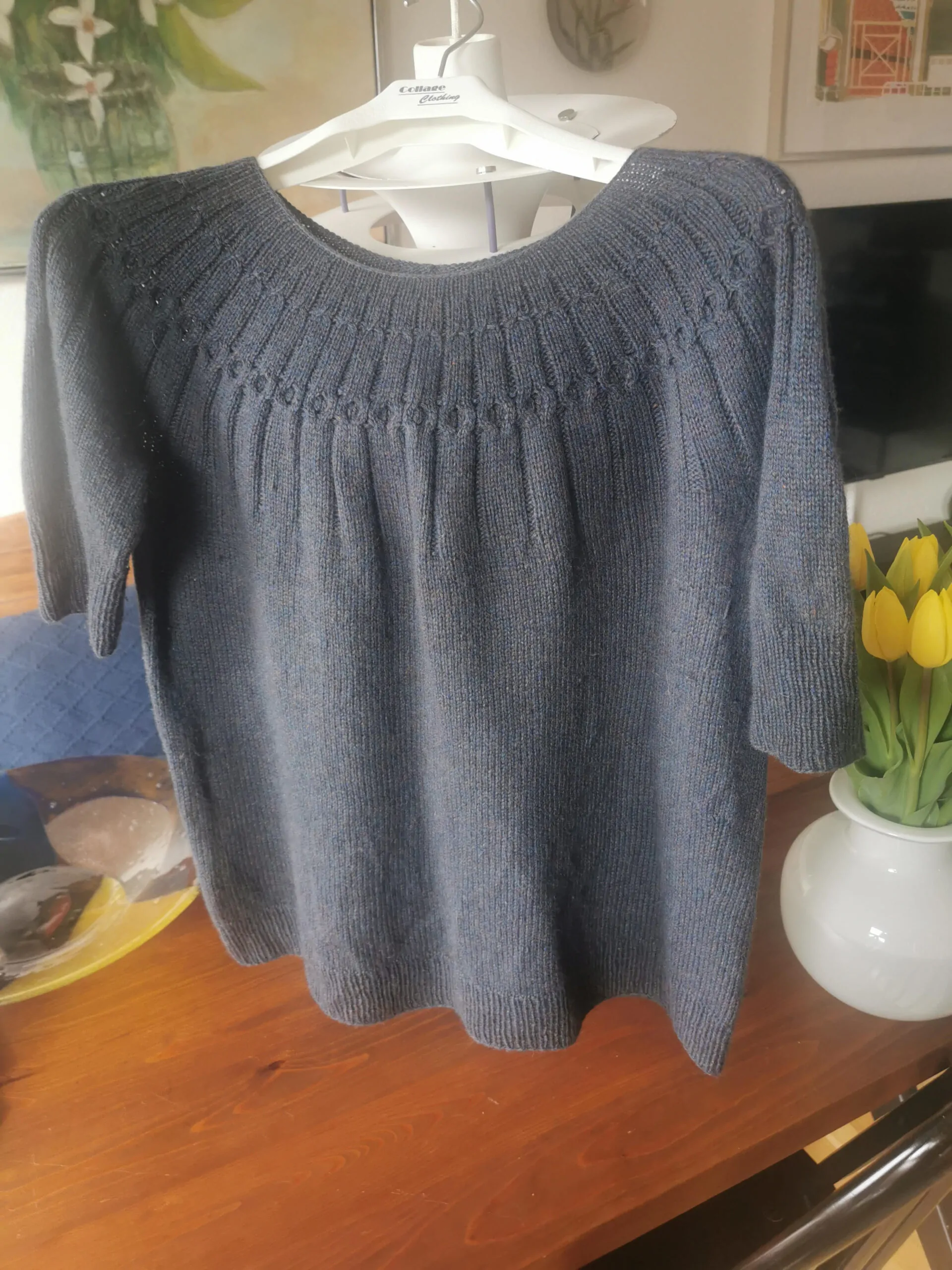 The sweater she made was made using a 2/27 100% cashmere machine yarn, worked in two strands.